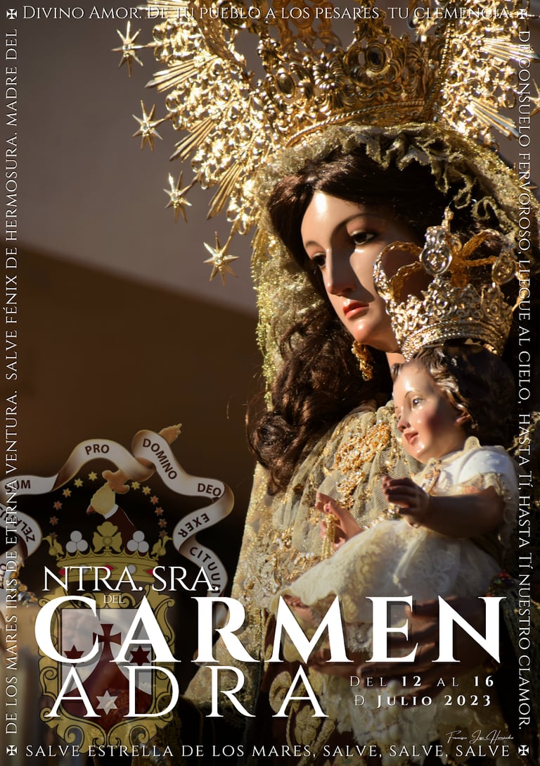 La imagen muestra a la Virgen del Carmen coronada y revestida con sus mejores galas, portando en sus brazos al Divino Niño, símbolo de amor y protección. A su lado, el escudo de la ciudad refuerza la unión inseparable entre Adra y su Reina del Mar. La tipografía, elegante y solemne, enmarca la escena acompañada de los versos de la Salve Marinera, que envuelven visualmente el cartel con un aire de oración perpetua.
