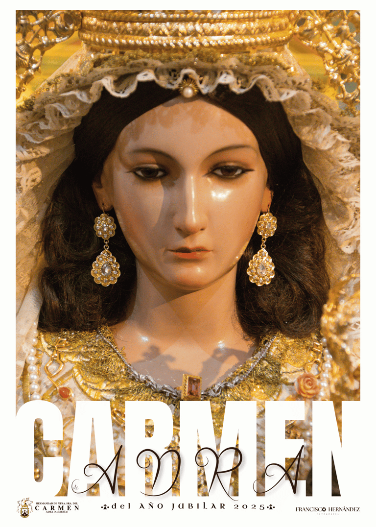 El diseño del cartel se completa con la rotulación central “CARMEN” en gran formato, sobre la que se escribe con elegancia “Adra”, en alusión directa al pueblo que le rinde honor. En la base, la inscripción “del Año Jubilar 2025” enmarca esta obra dentro de un año extraordinario para la Hermandad y para toda la ciudad.