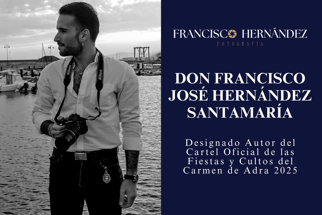 La Junta de Oficiales de la Hermandad de Nuestra Señora del Carmen de Adra (Almería) ha designado, por tercer año consecutivo, al fotógrafo y diseñador Francisco José Hernández Santamaría como autor del Cartel Oficial de las Fiestas y Cultos del Carmen de Adra 2025, una obra que será presentada el próximo sábado 7 de junio a las 20:00 horas en la Iglesia Parroquial de la Inmaculada Concepción de Adra, tras la celebración de la Santa Misa.